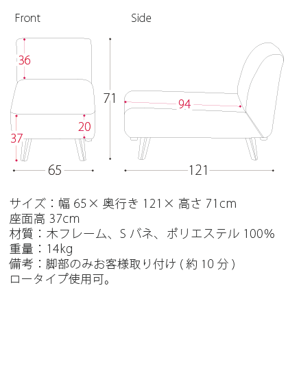 余計な物がない洗練されたシンプルデザインはコーディネートし易く、様々なお部屋との相性も抜群です サイズ:幅65×奥行き121×高さ71cm 座面高37cm 材質:木フレーム、Sバネ、ポリエステル100% 重量:14kg 備考:脚部のみお客様取り付け(約10分)、ロータイプ使用可。