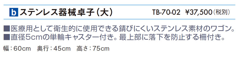 TB-70-02 ステンレス器械卓子(大) 医療用として衛生的に使用できる錆びにくいステンレス素材のワゴン。