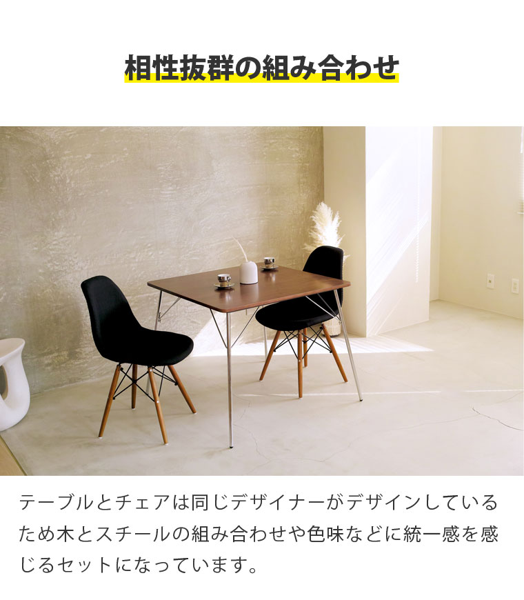 各商品の詳細、単品でのご購入はこちら DTM-2とのセット商品一覧はこちら その他のダイニングセット商品一覧はこちら 相性抜群の組み合わせ テーブルとチェアは同じデザイナーがデザインしているため木とスチールの組み合わせや色味などに統一感を感じるセットになっています。